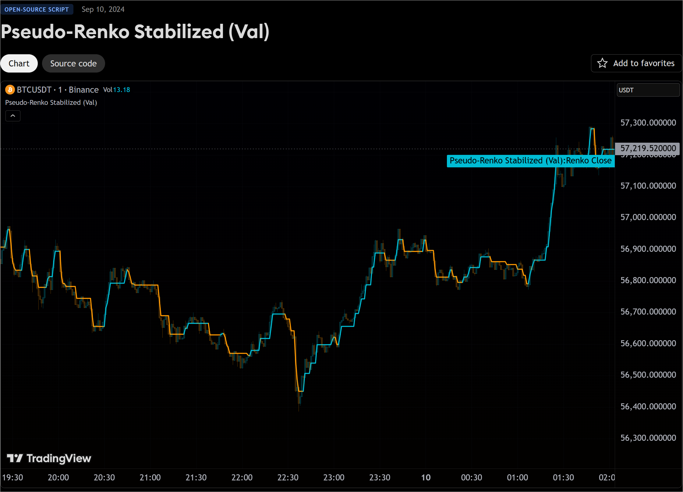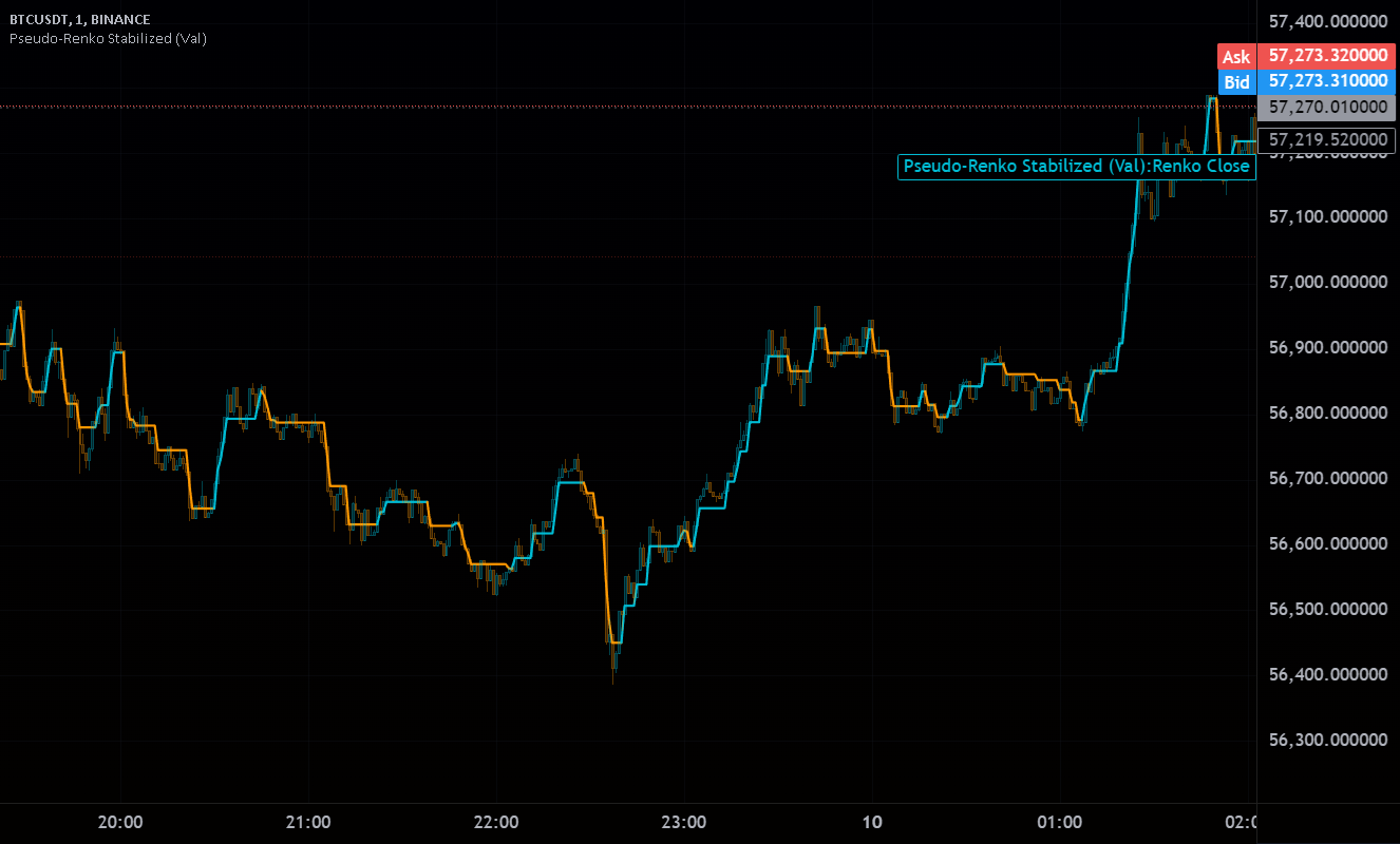 Calculates and returns the Pseudo-Renko Stabilized value (or close price) based on a given input value, along with the direction of the current Renko brick. This function adapts the traditional Renko brick size dynamically based on the volatility of the input value using a combination of SMA and EMA calculations. The calculated price represents the closing price of the most recent Pseudo-Renko brick, while the direction indicates the trend (1 for uptrend, -1 for downtrend).