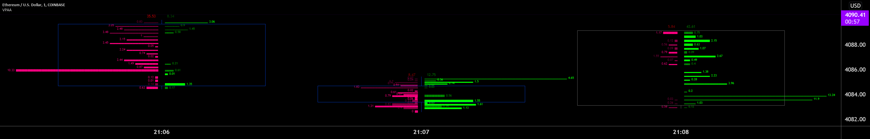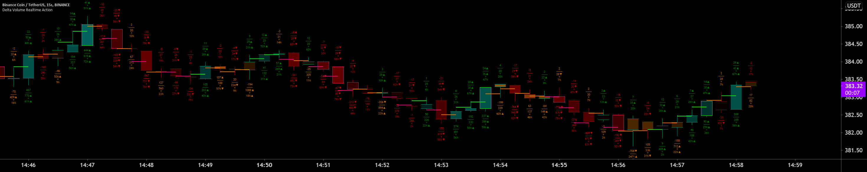 This indicator displays on-chart, realtime, delta volume and delta ticks information for each bar. It aims to provide traders who trade price action on small timeframes with volume and tick information gathered as updates come in the chart's feed. It builds its own candles, which are optimized to display volume delta information. It only works in realtime.