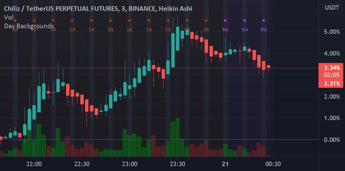 Very Simple study script to colorize every day of the month a unique color, with stripes on Saturday and Sunday, and small text at the top to note the current day of the week. Currently set to GMT-7, feel free to change it to your own time zone. Thanks to all the pine coders out there for the inspiration and massive thanks to the open-source community for all the things I learn from playing with your scripts.