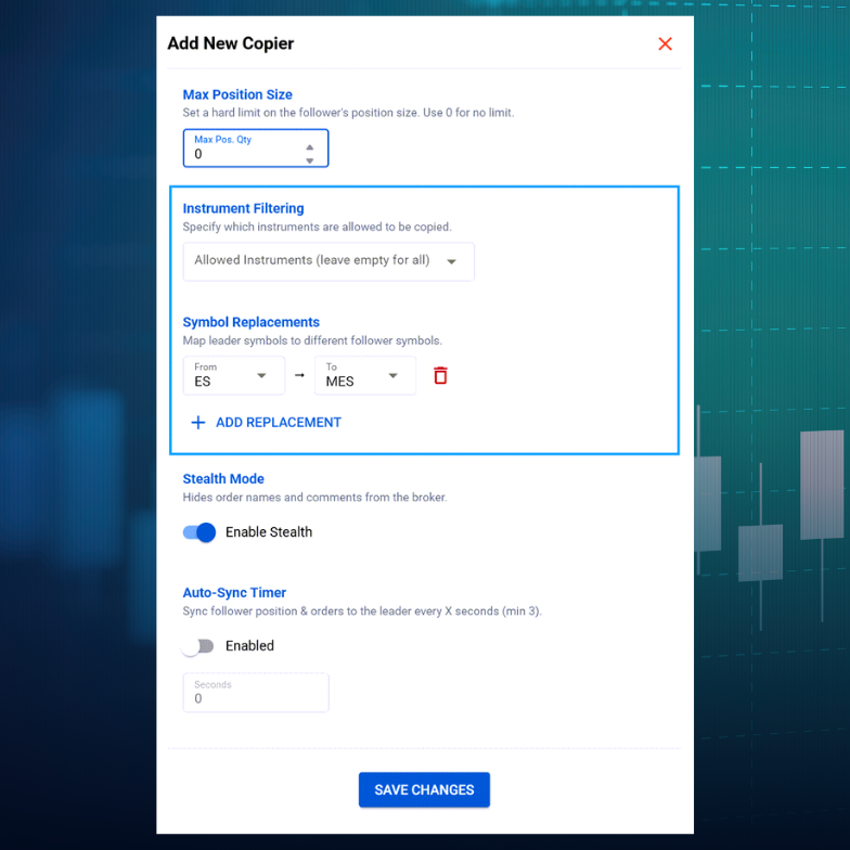 CrossTrade handles symbol replacement with full contract mathematics automatically. When your source account trades ES, the follower executes the same strategy using MES, maintaining identical trade logic while adjusting for appropriate contract sizing. All timing and risk management relationships are preserved.