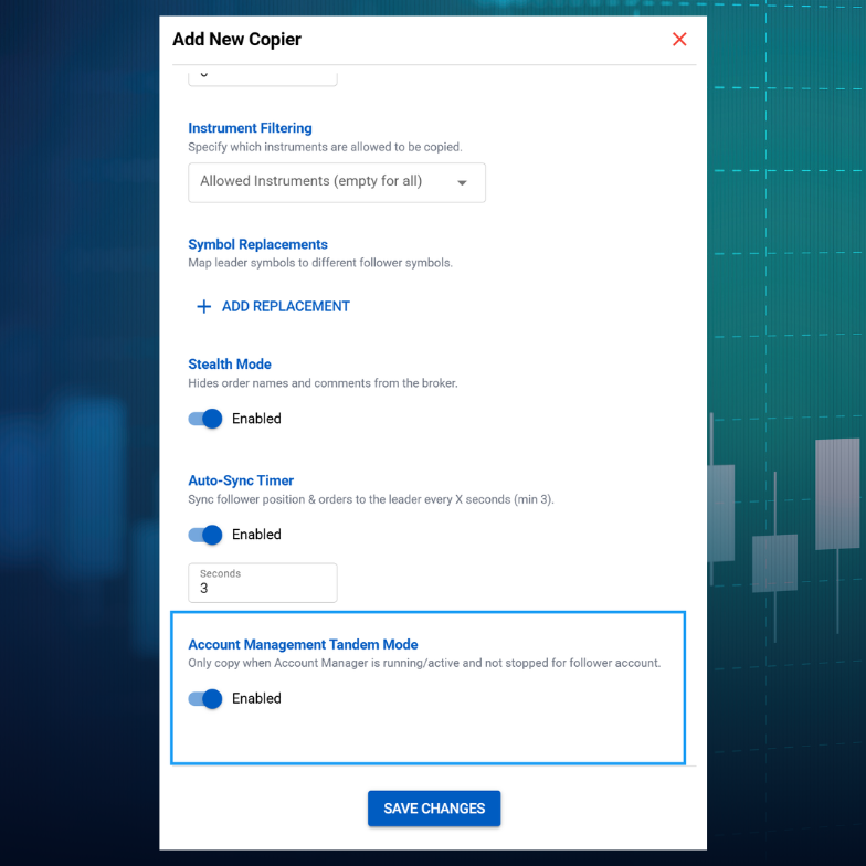 - Replikanto: No native Account Manager integration. Relies on "Follower Guard" to close and disarm positions in certain scenarios.