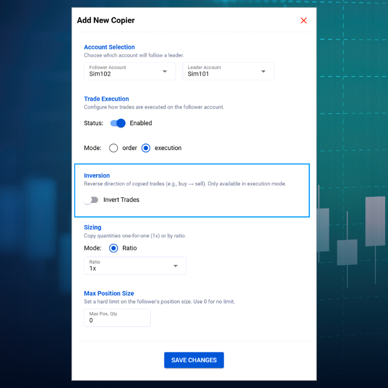 CrossTrade's trade inversion functionality transforms any follower account into an automatic hedge. When enabled, the follower executes trades in the opposite direction of the leader, creating instant, hands-free hedging relationships.