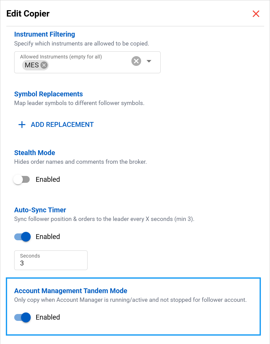 The second major addition is Tandem Mode, which binds copying behavior to your NinjaTrader Account Manager monitors. This isn't just a nice-to-have feature, it's essential risk management.