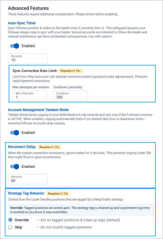 The Trade Copier picks up Fills Only mode, which limits copy actions to confirmed fills rather than order submissions. Strategy Tag handling has been wired into the copier so that tagged positions are respected during copy operations. Reconnect safety delays prevent the copier from immediately resuming activity after a connection recovery, giving the system time to re-establish accurate state before copying resumes. And auto-sync rate limit controls prevent rapid repeated correction attempts that could stack up during volatile conditions.