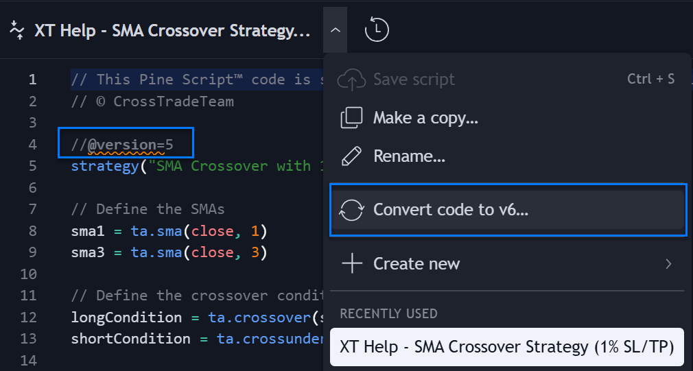 As with prior updates, scripts written in earlier versions of Pine Script™ remain fully functional. However, to leverage the new features exclusive to v6, it’s recommended to convert your scripts using the new v6 Conversion Tool. This tool, accessible through the “Manage script” menu in the Pine Editor, simplifies the process with an automated “Convert code to v6” option.