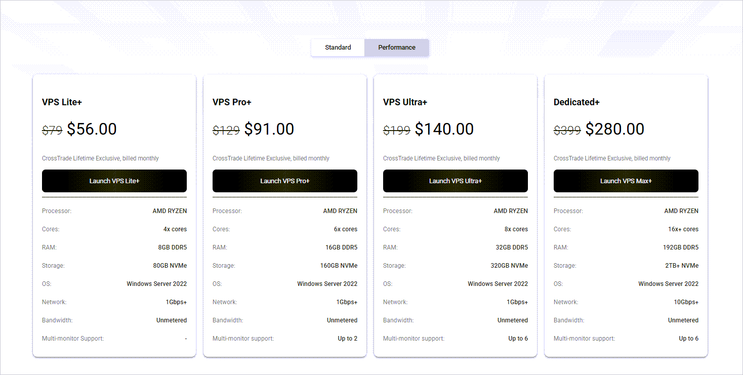 The Performance line exists because some trading strategies genuinely need better hardware. If you're running lean strategies on a handful of instruments, the Standard line will serve you fine and save you money.