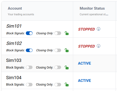 This method allows you to systematically place trades in one account at a time until the monitor state changes to STOPPED because a stop (or hopefully) a take profit threshold is reached.